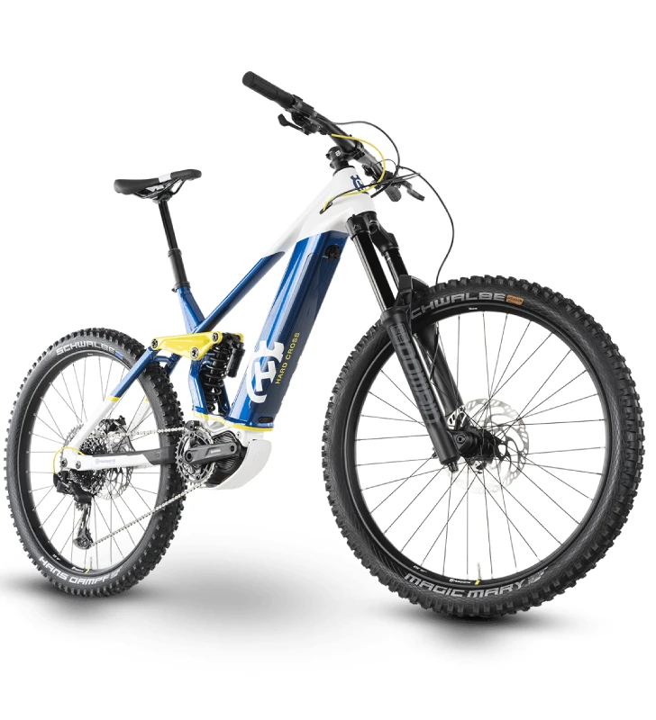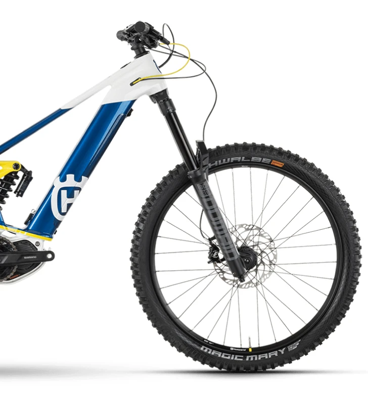- RUEDA DELANTERA: Rim: Ryde Disc35, soltado, Tubeless Ready / Hub: Husqvarna DA210F, 6 orificios, 15×110 mm, Eje de la rueda